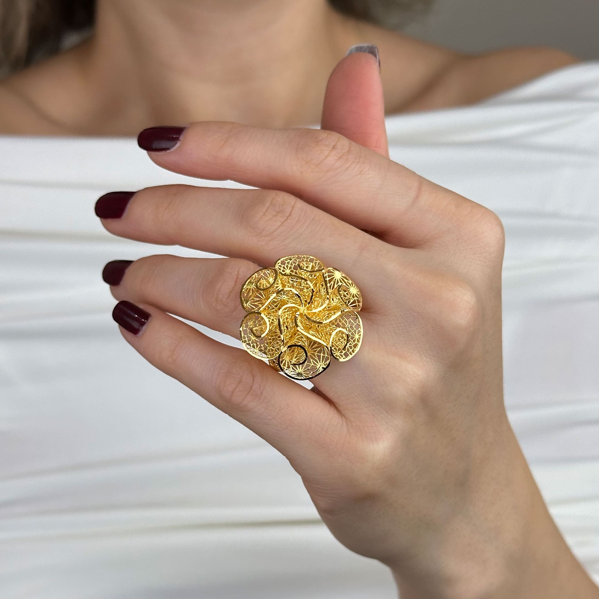 Çiçek formu; zarafeti, yenilenmeyi ve içtenliği simgeler. Tül detaylı bu tasarım, altının ışıltısını yumuşak ve rafine bir estetikle buluşturur.