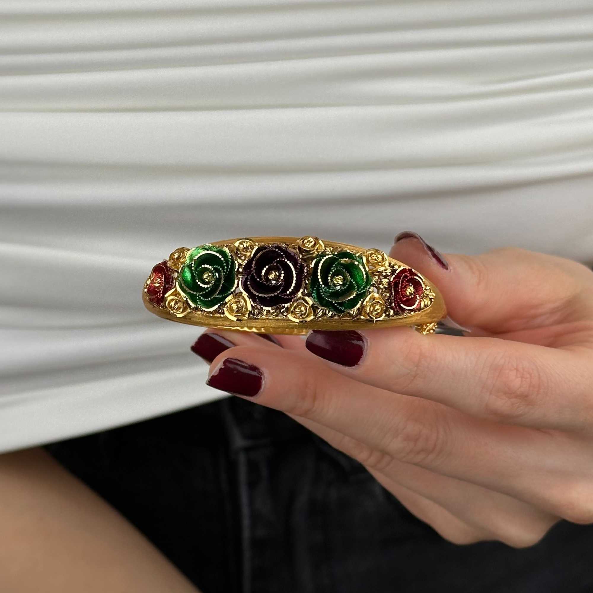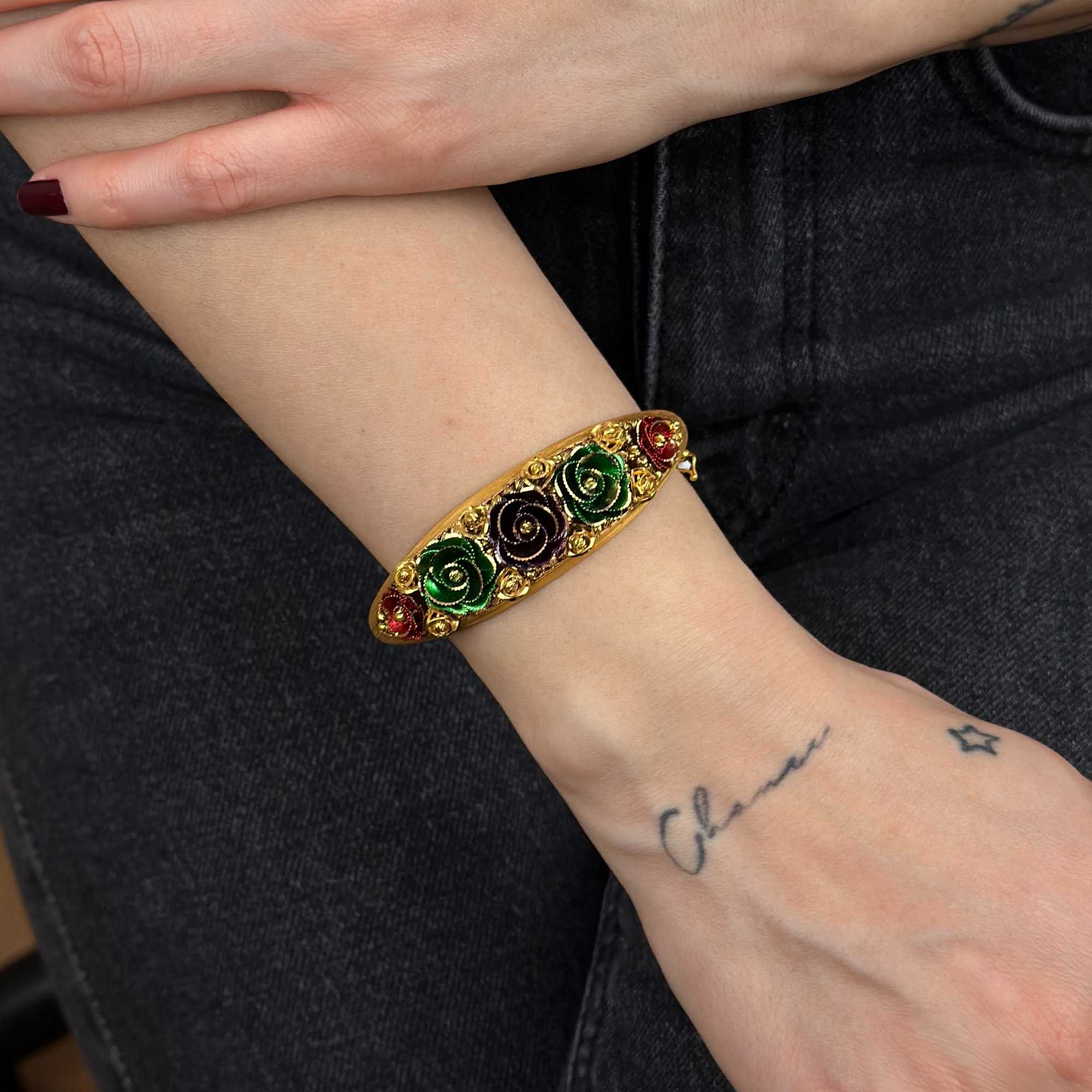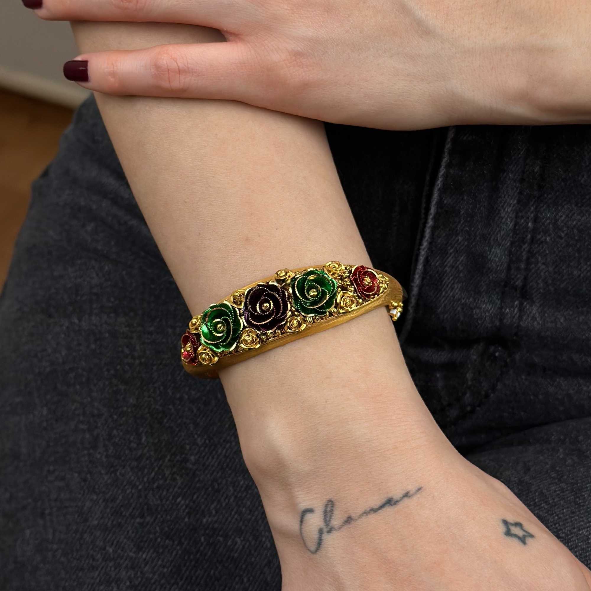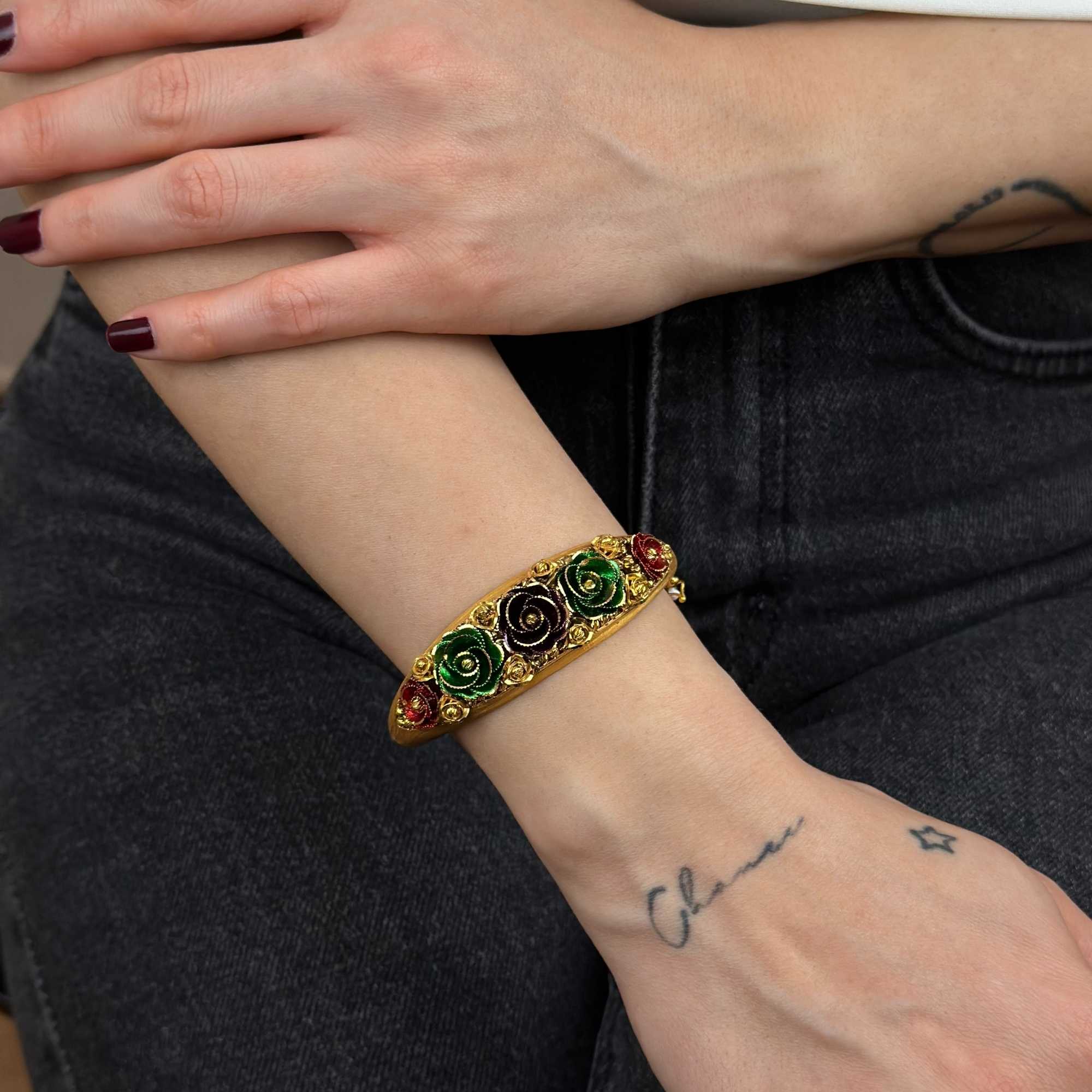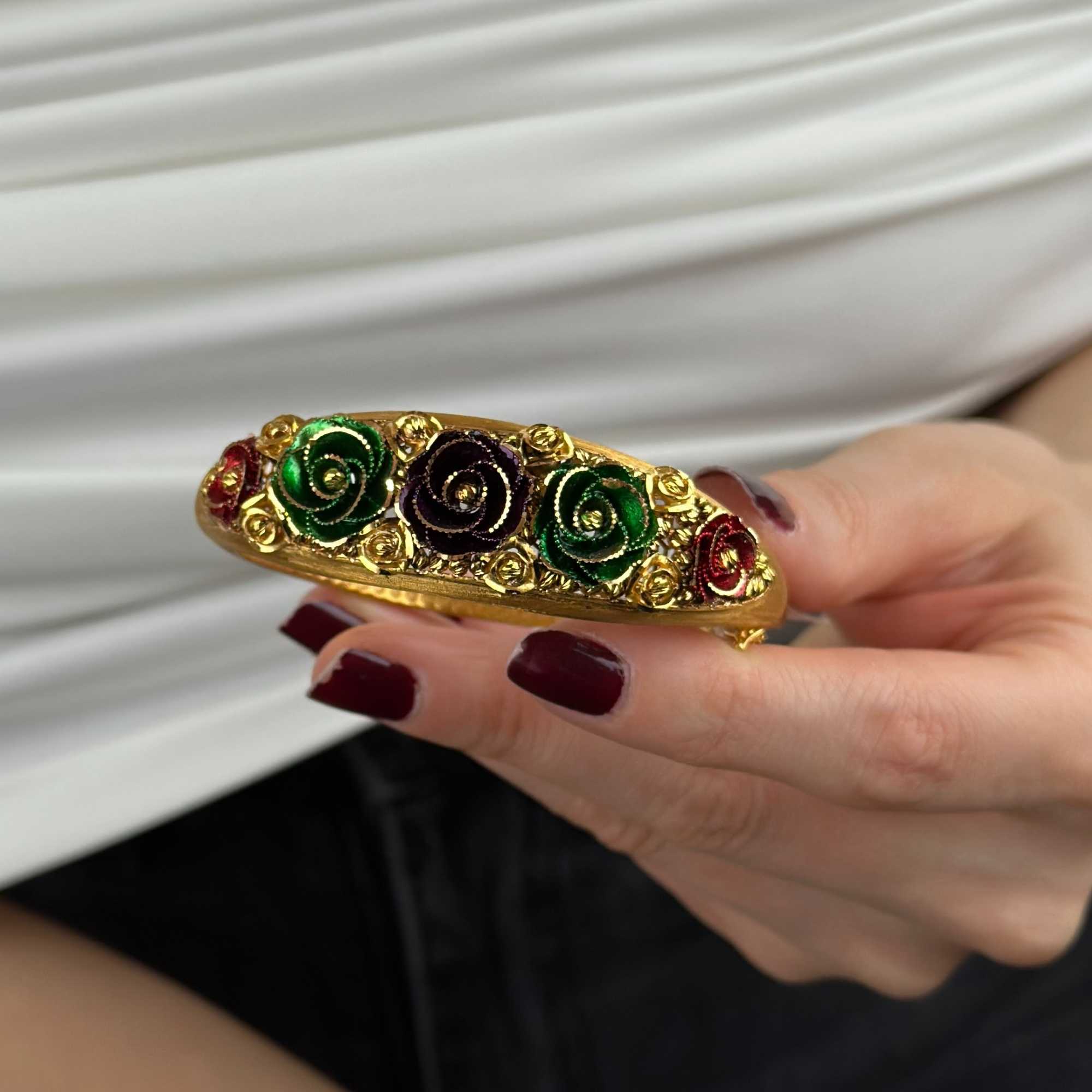 Gül buketi detayı; sevgi, zarafet ve özel anların simgesidir. Renkli dorika dokunuşlarıyla birlikte kelepçeye sofistike bir ışıltı kazandırır.