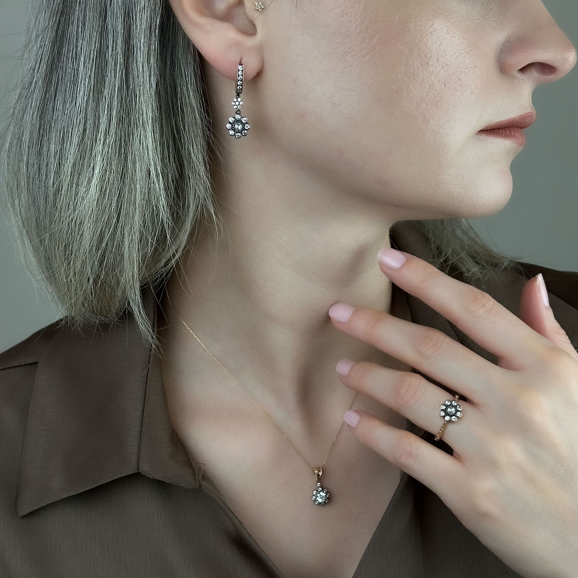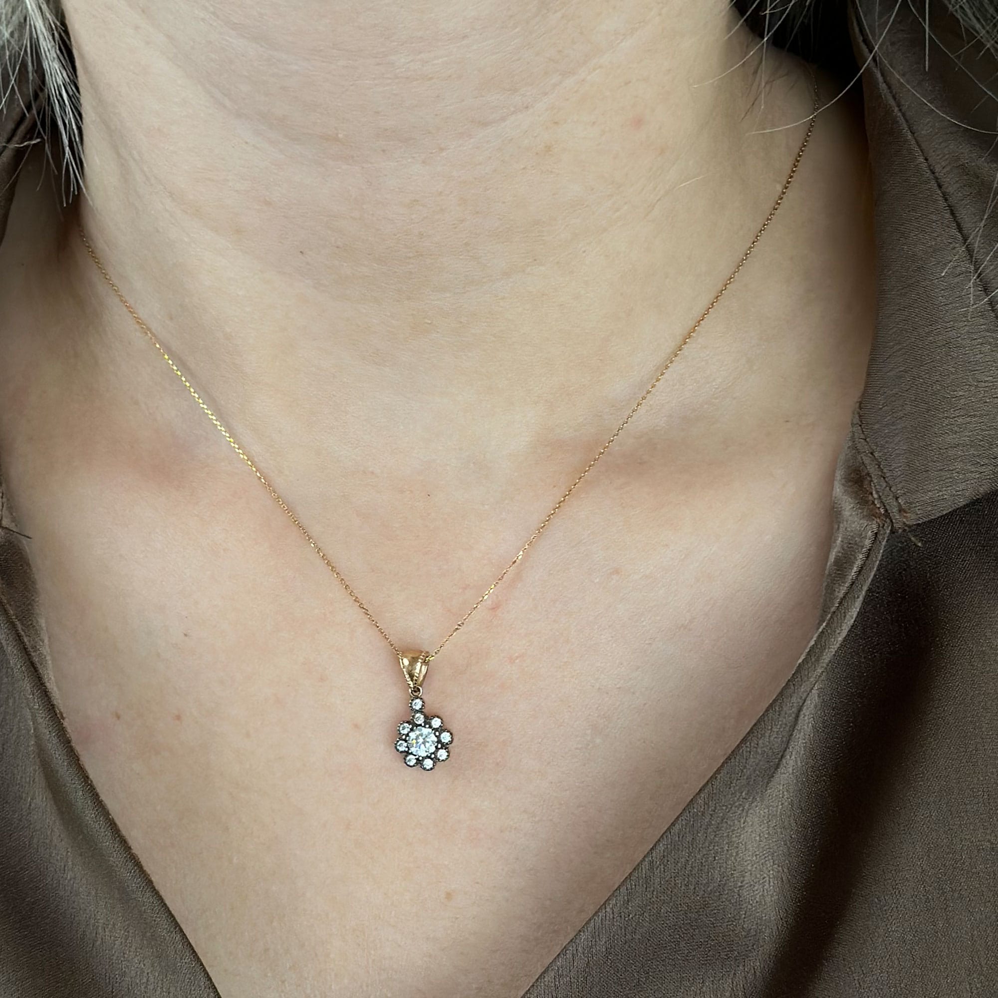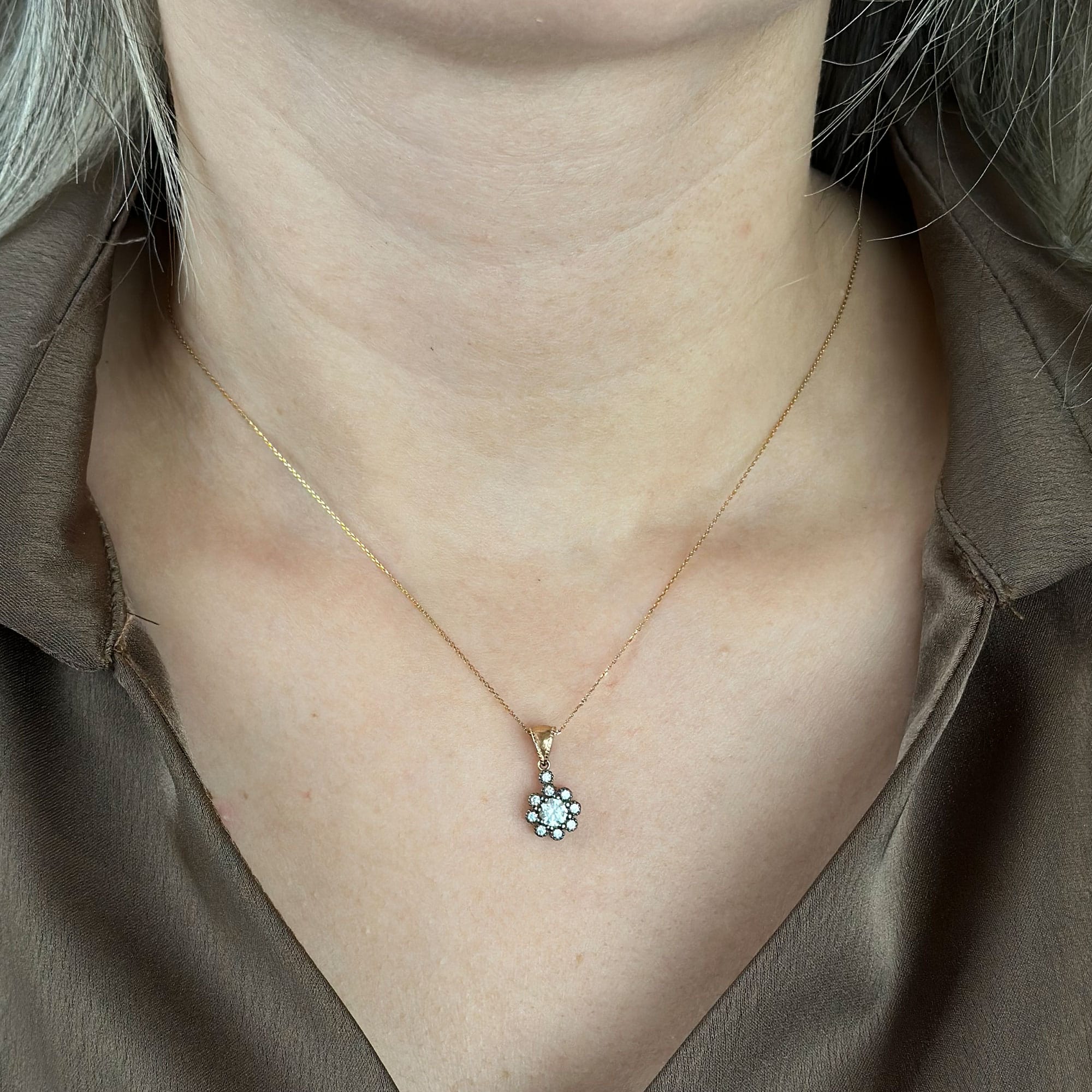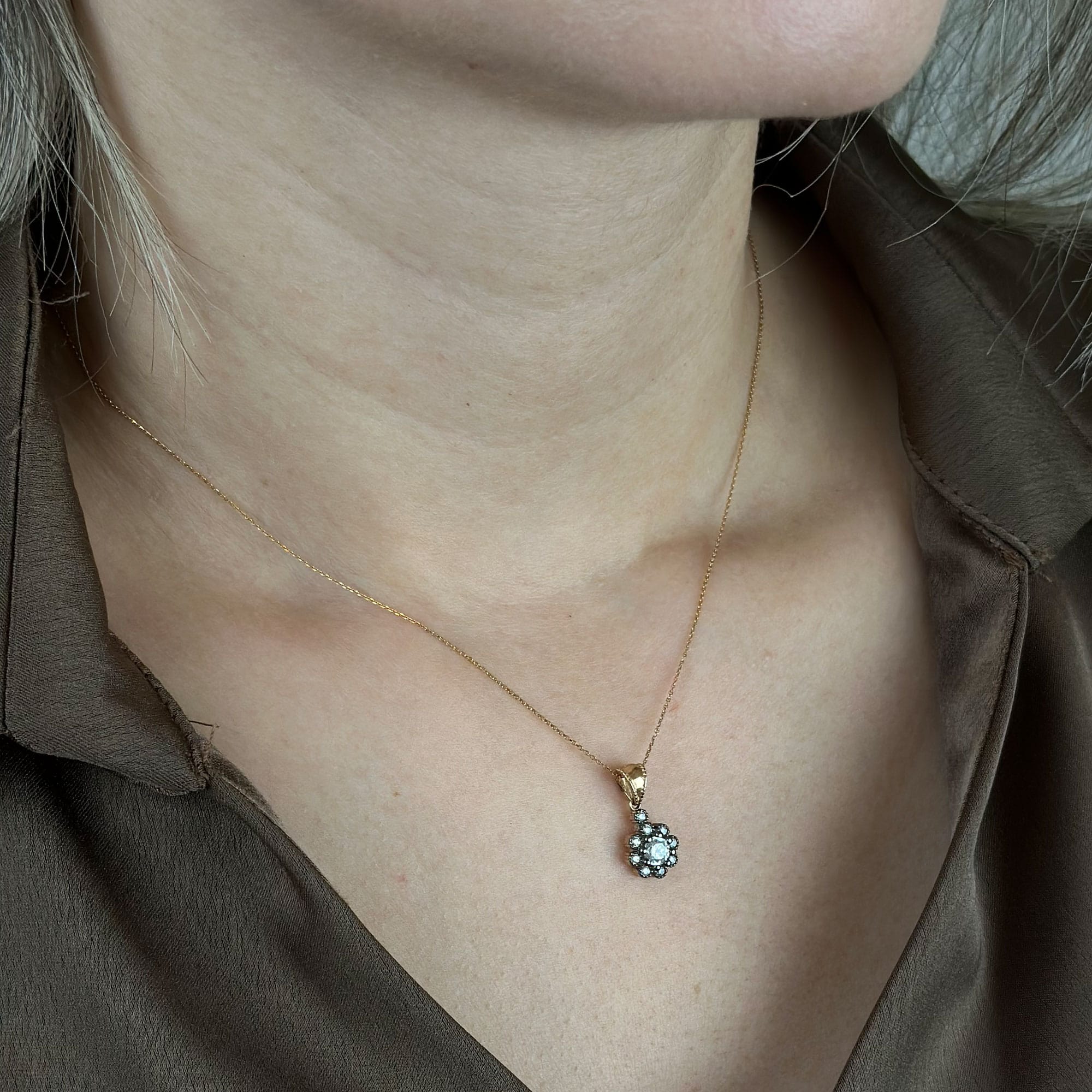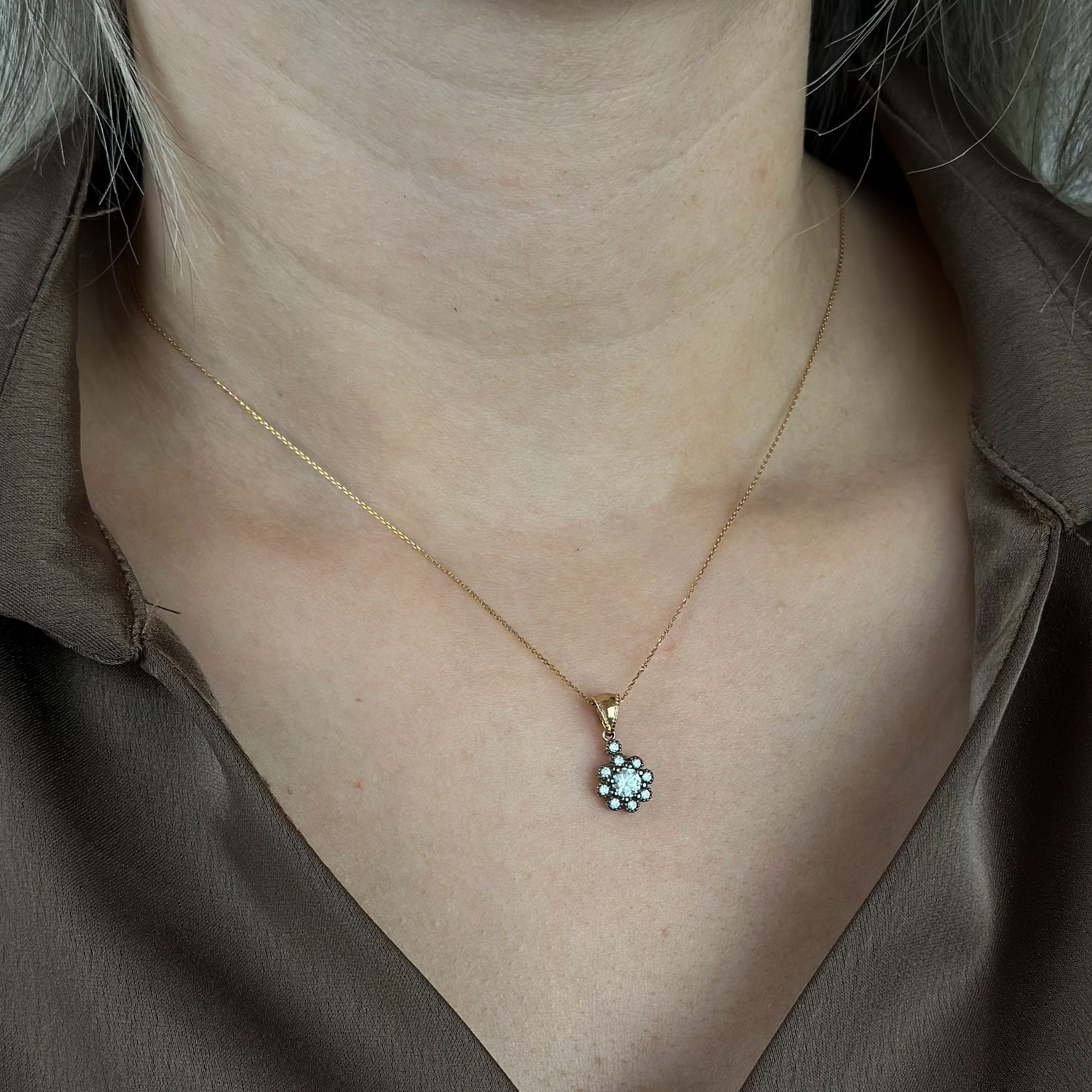 Bu 14 ayar altın çiçek kolye, elmas montür detaylarıyla ışığı her açıdan yakalayarak zarif bir ışıltı sunar. Minimal şıklığı ve romantik çiçek formu sayesinde hem günlük kullanımda hem de özel gün kombinlerinde göz alıcı bir tamamlayıcı olur.