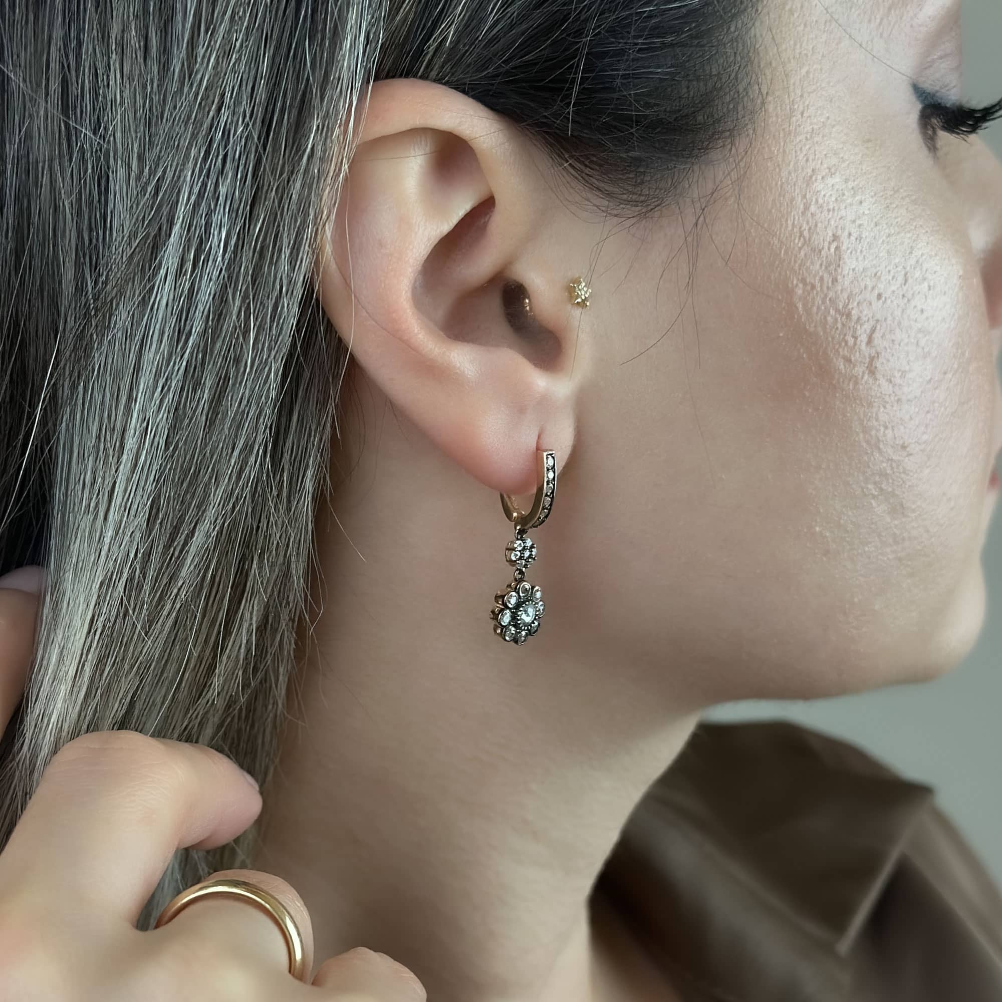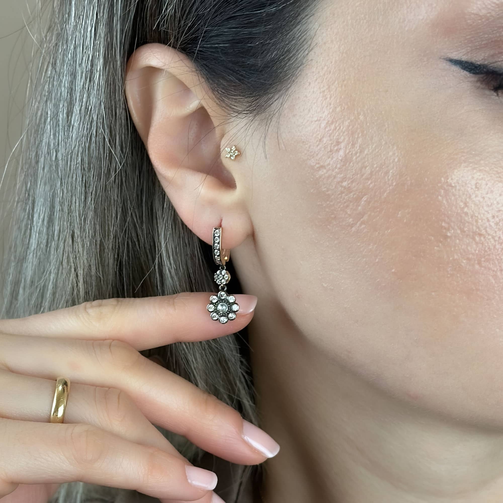 Altının sıcak tonuyla elmas montür detaylarının birleşimi, küpeyi hem modern hem de klasik tarzı seven kadınlar için vazgeçilmez bir parça haline getirir. Hafif yapısı sayesinde gün boyu rahatlıkla kullanılırken, zarif çiçek motifi romantik bir duruş yaratır.