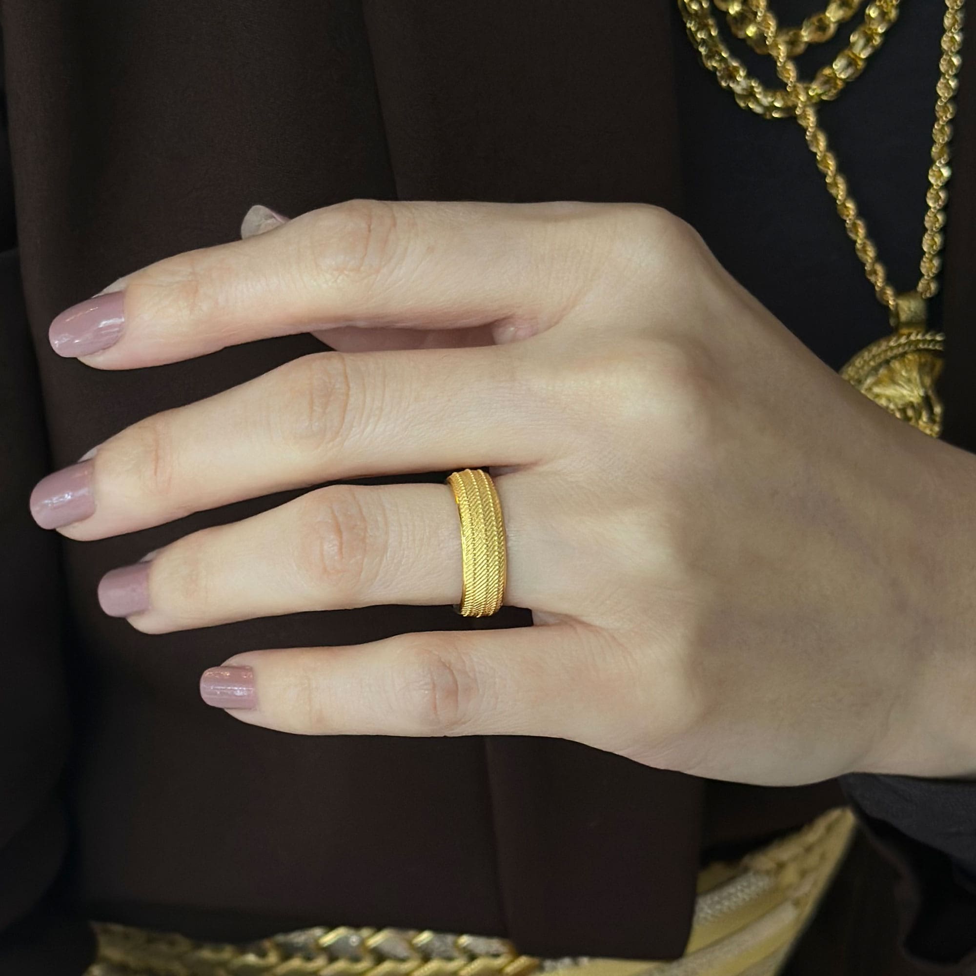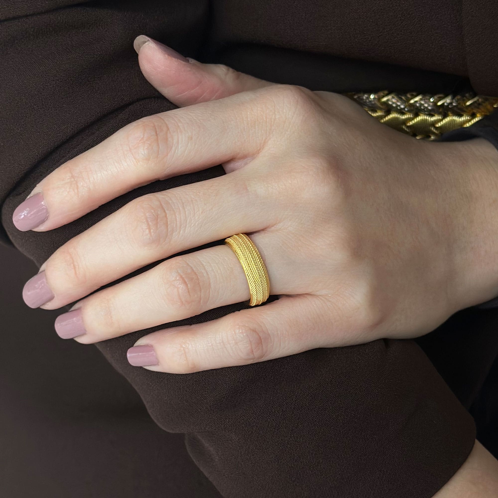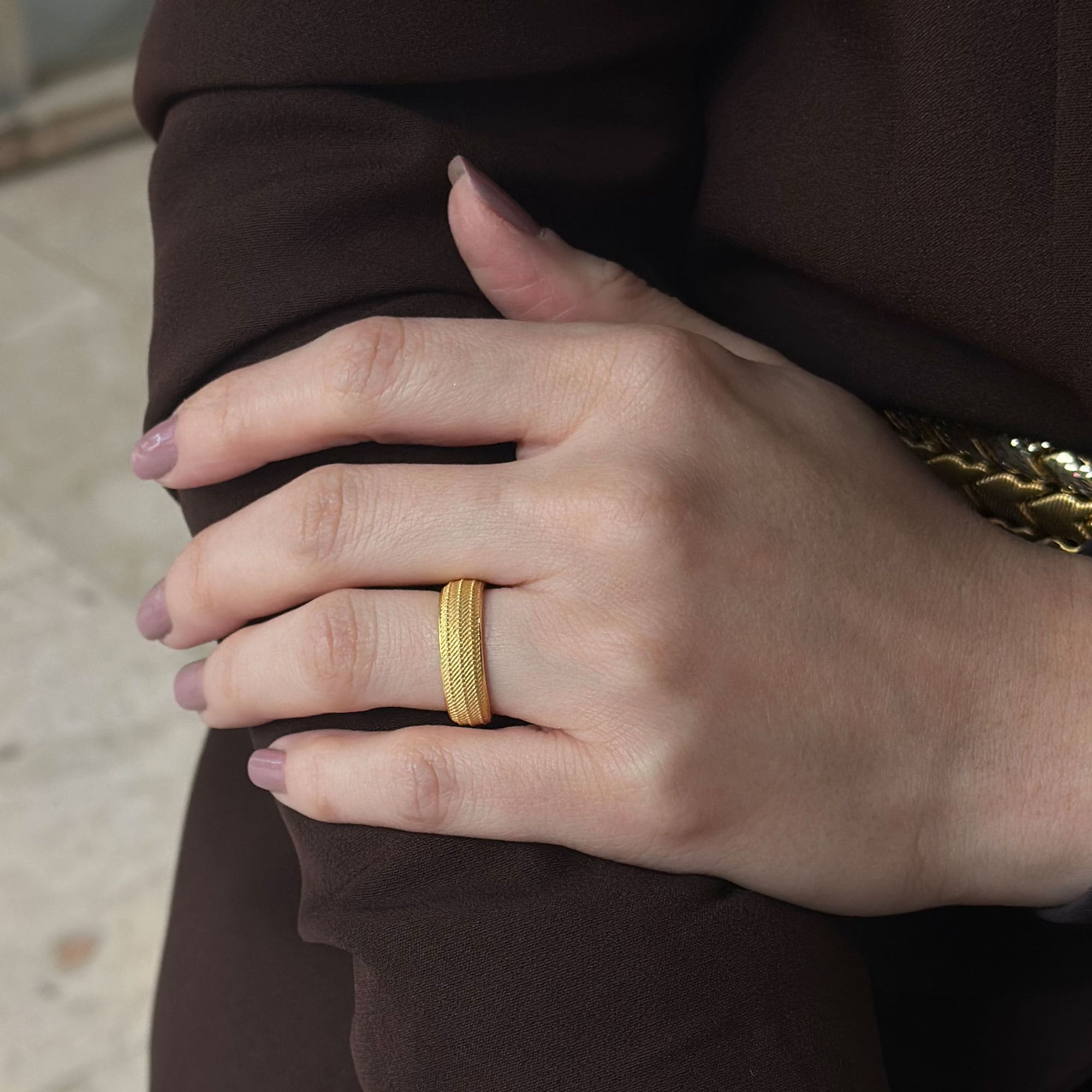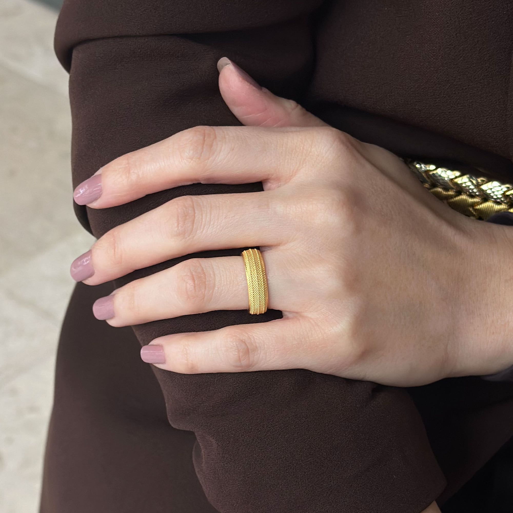 Zarif dokusu ve ustalıkla örülmüş formuyla öne çıkan hasır yüzük, 14 ayar altın el işçiliğinin en şık yansımalarından biridir. Klasik altın takılara modern bir yorum katan bu özel tasarım, hem günlük kullanımda hem de özel anlarda stilinizi tamamlar.