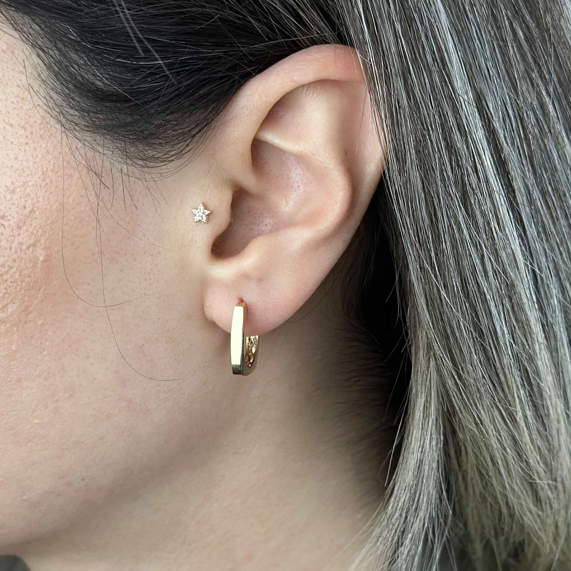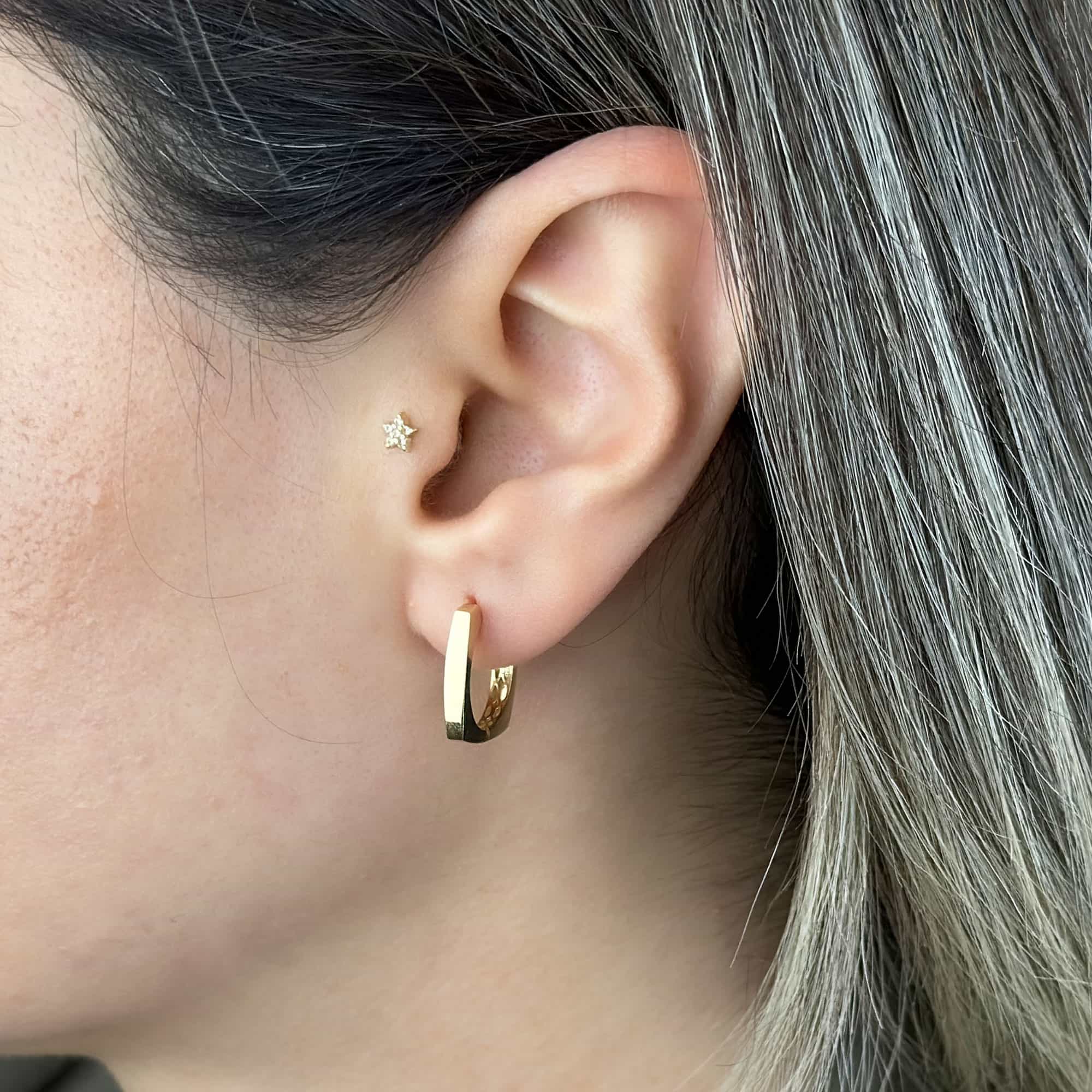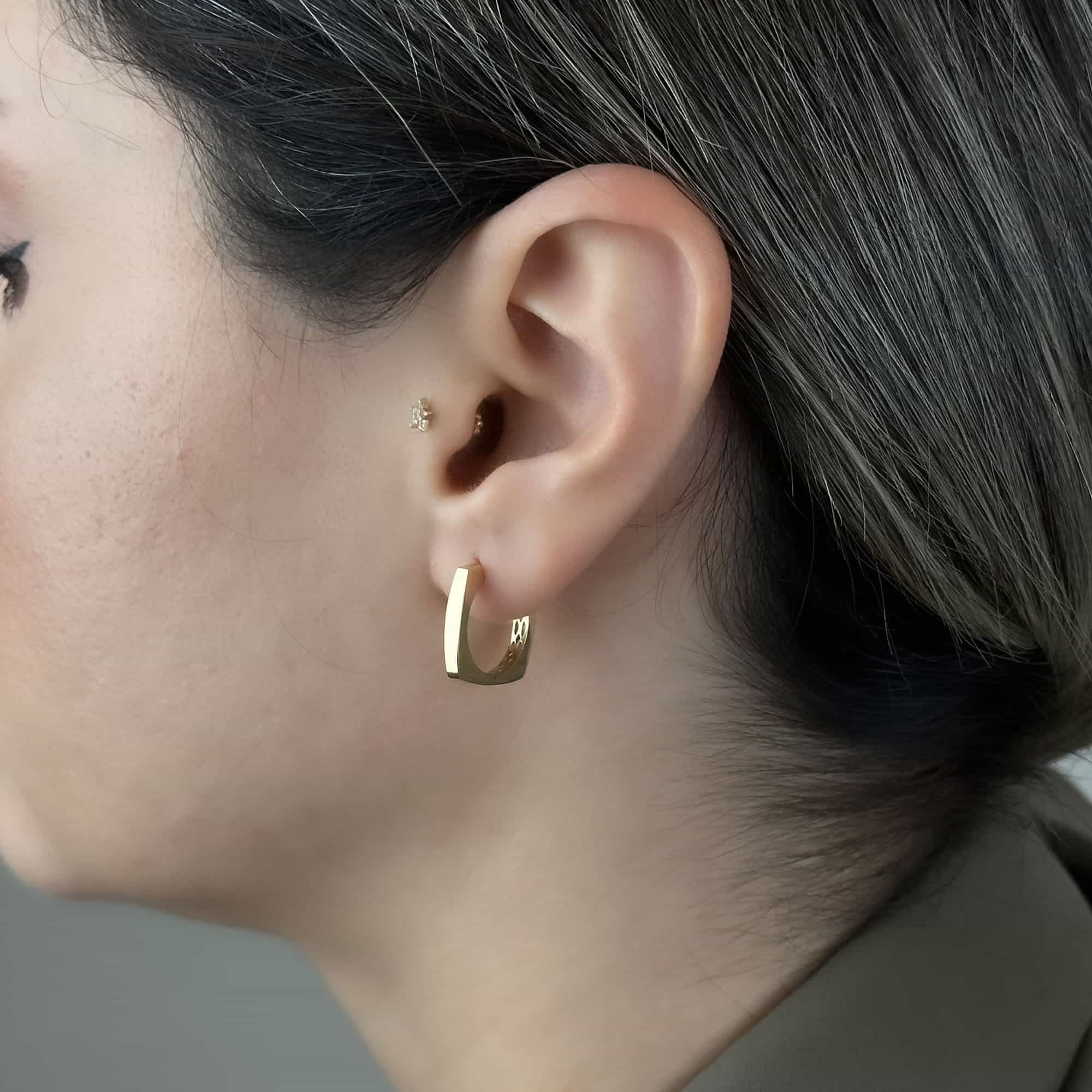 Köşeli Taşsız 14 Ayar Altın Halka Küpe, modern çizgisi ve sade zarafetiyle günlük kullanıma mükemmel şekilde uyum sağlar. Köşeli formu sayesinde klasik halka küpe görünümüne modern bir dokunuş eklerken, taşsız tasarımı sayesinde her tarza kolayca uyum sağlayan minimal bir şıklık sunar.