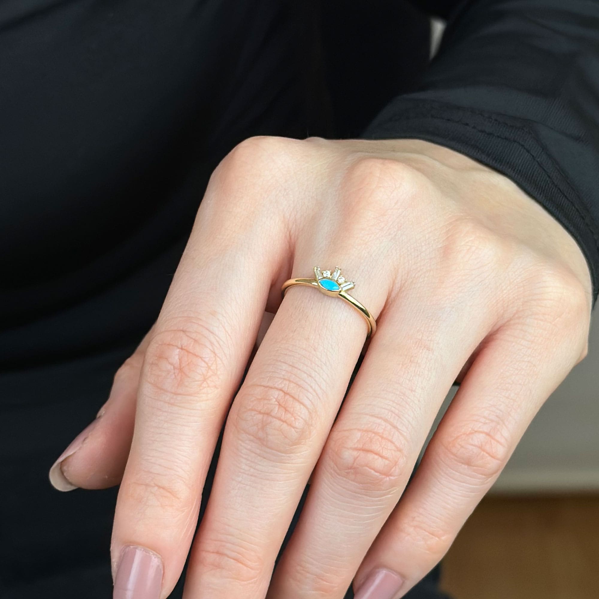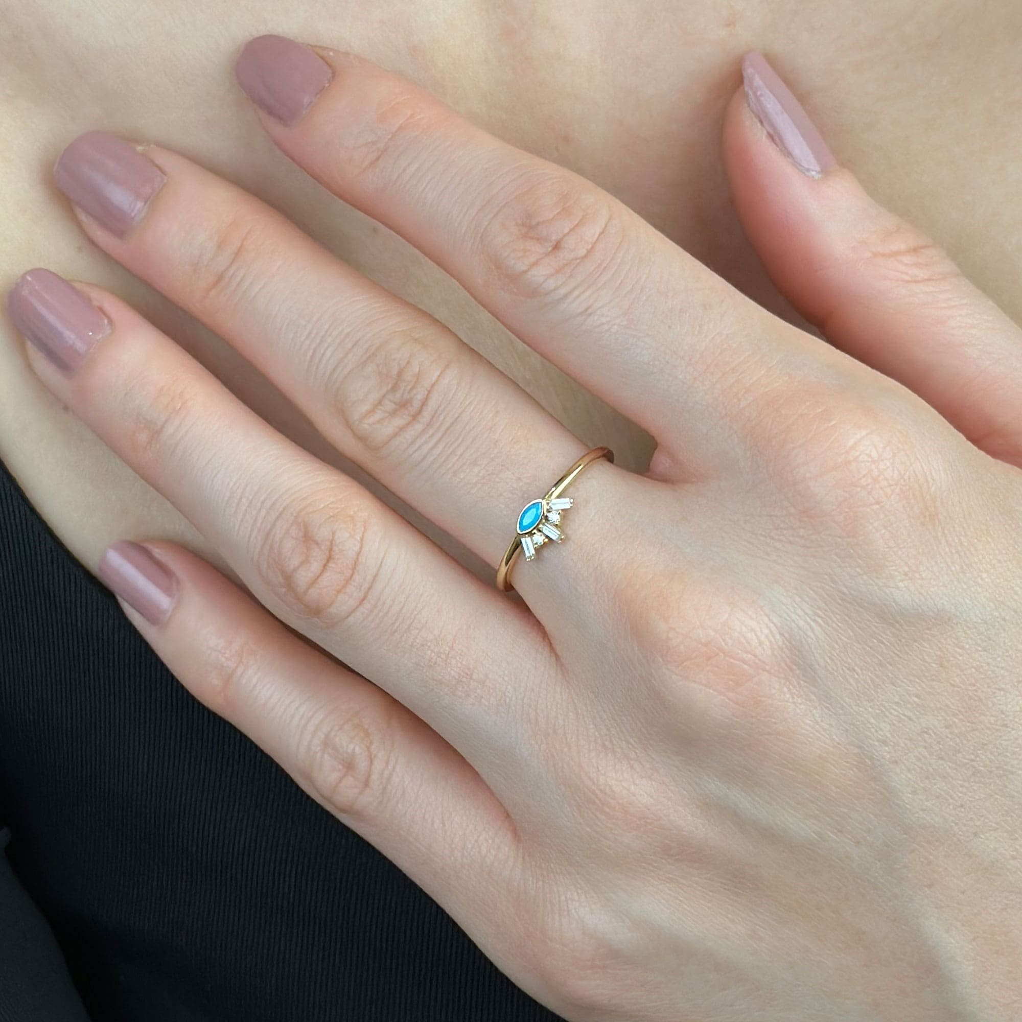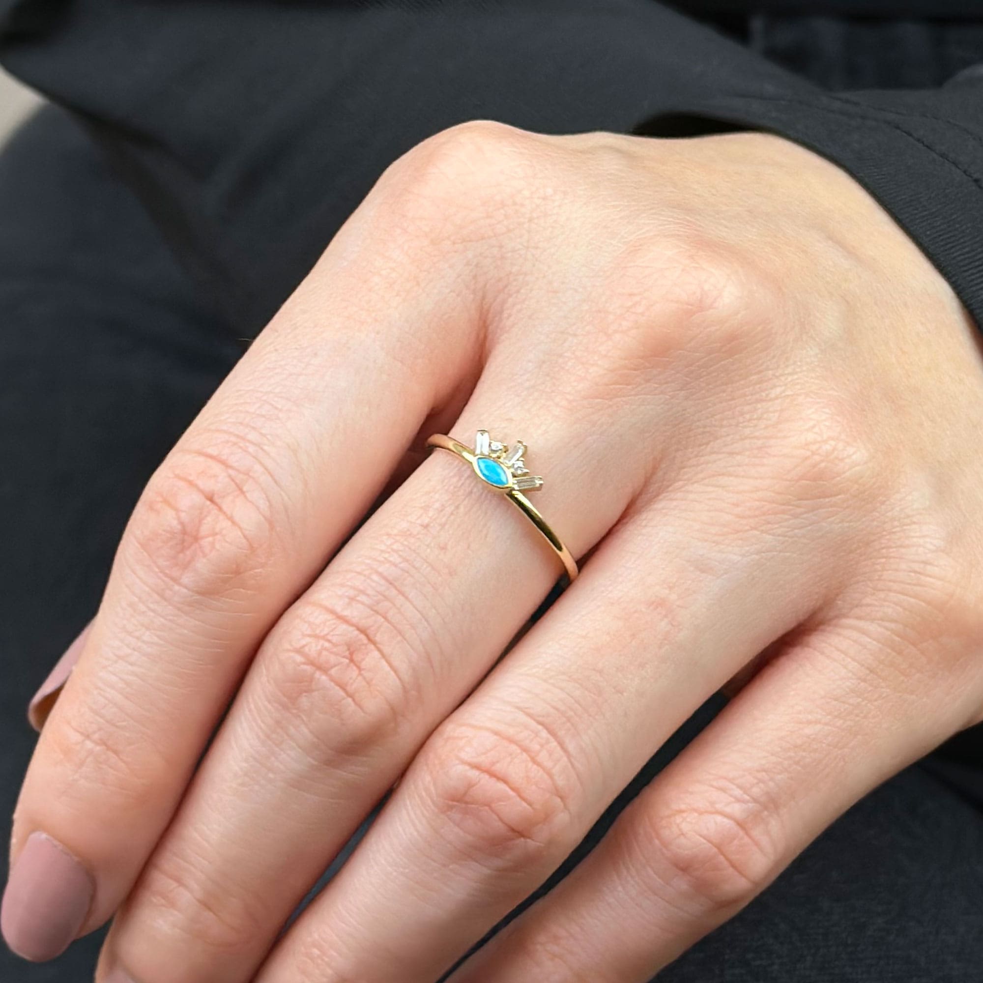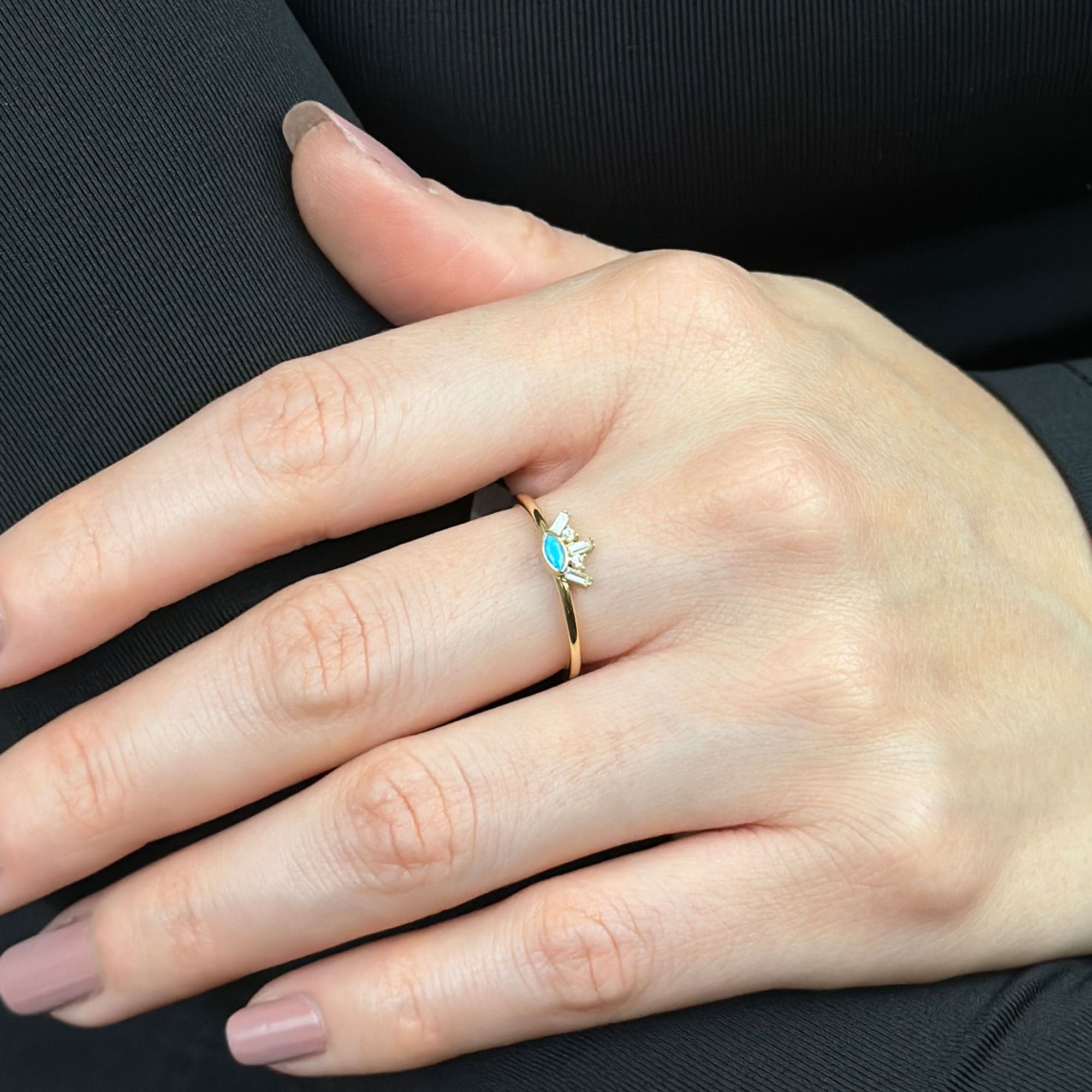 Mavi taşın nazar sembolüyle olan uyumu, yüzüğe hem anlam hem de farklı bir ışıltı kazandırır. Eklem yüzük formu sayesinde tek başına minimal bir görünüm sunarken, diğer yüzüklerle birlikte kombinlendiğinde modern ve trend bir stil yaratır.