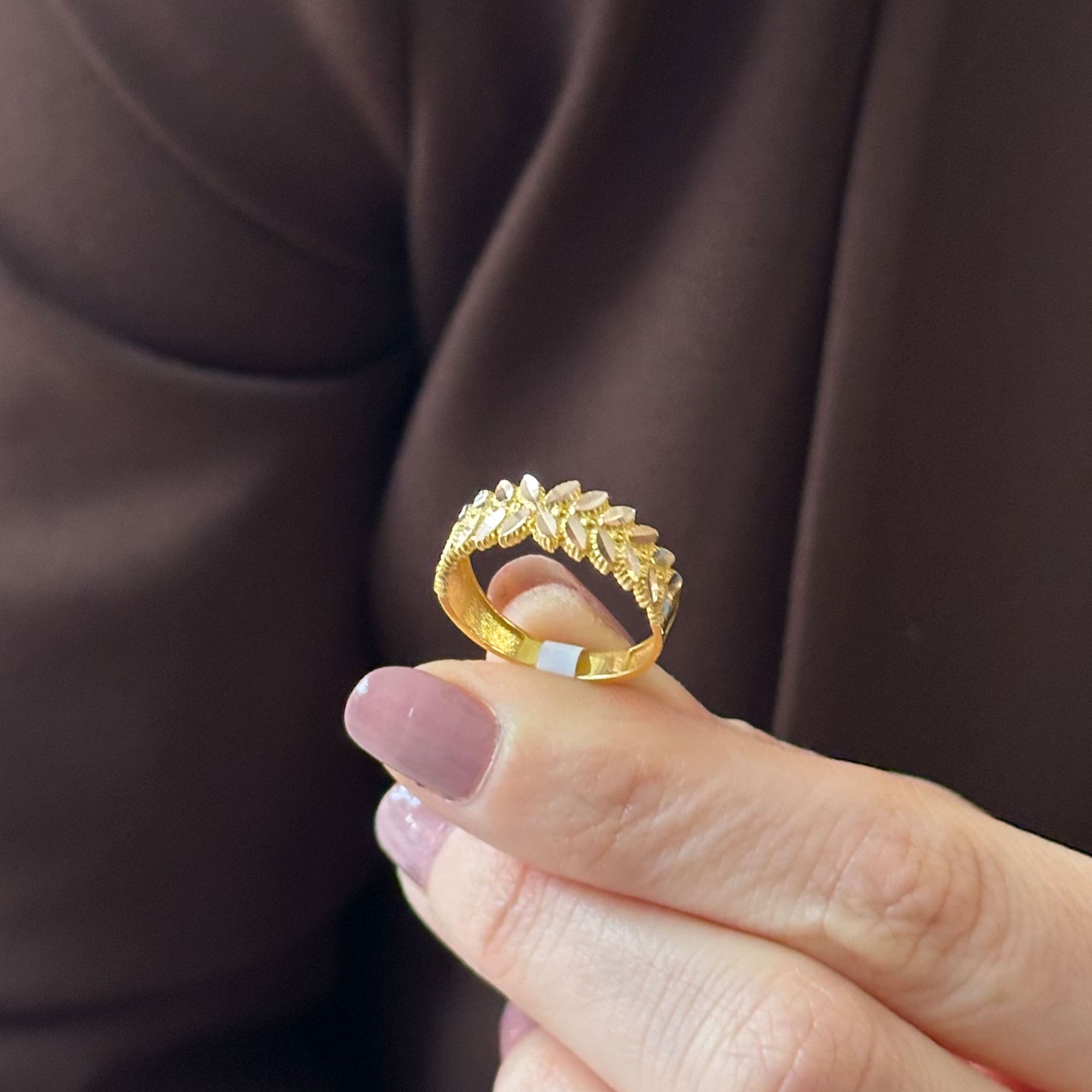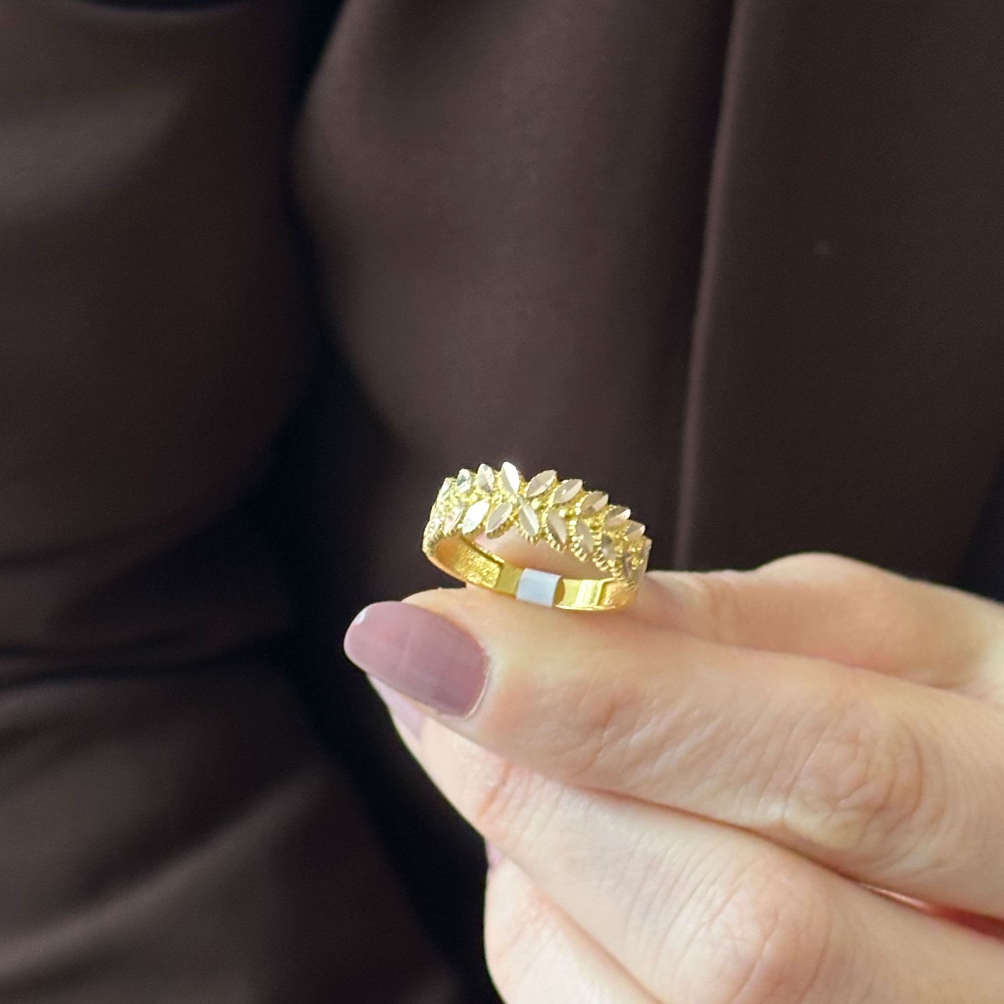 Sarmaşık ve yaprak formunun doğadan ilham alan çizgilerini modern el işçiliğiyle buluşturan 14 ayar altın tasarım yüzük, 22 ayar görünümlü parlak yüzeyiyle dikkat çeker. Altının sıcak dokusunu zarif detaylarla bir araya getiren bu özel model, hem şık hem de benzersiz aksesuar arayanlar için tasarlanmıştır.