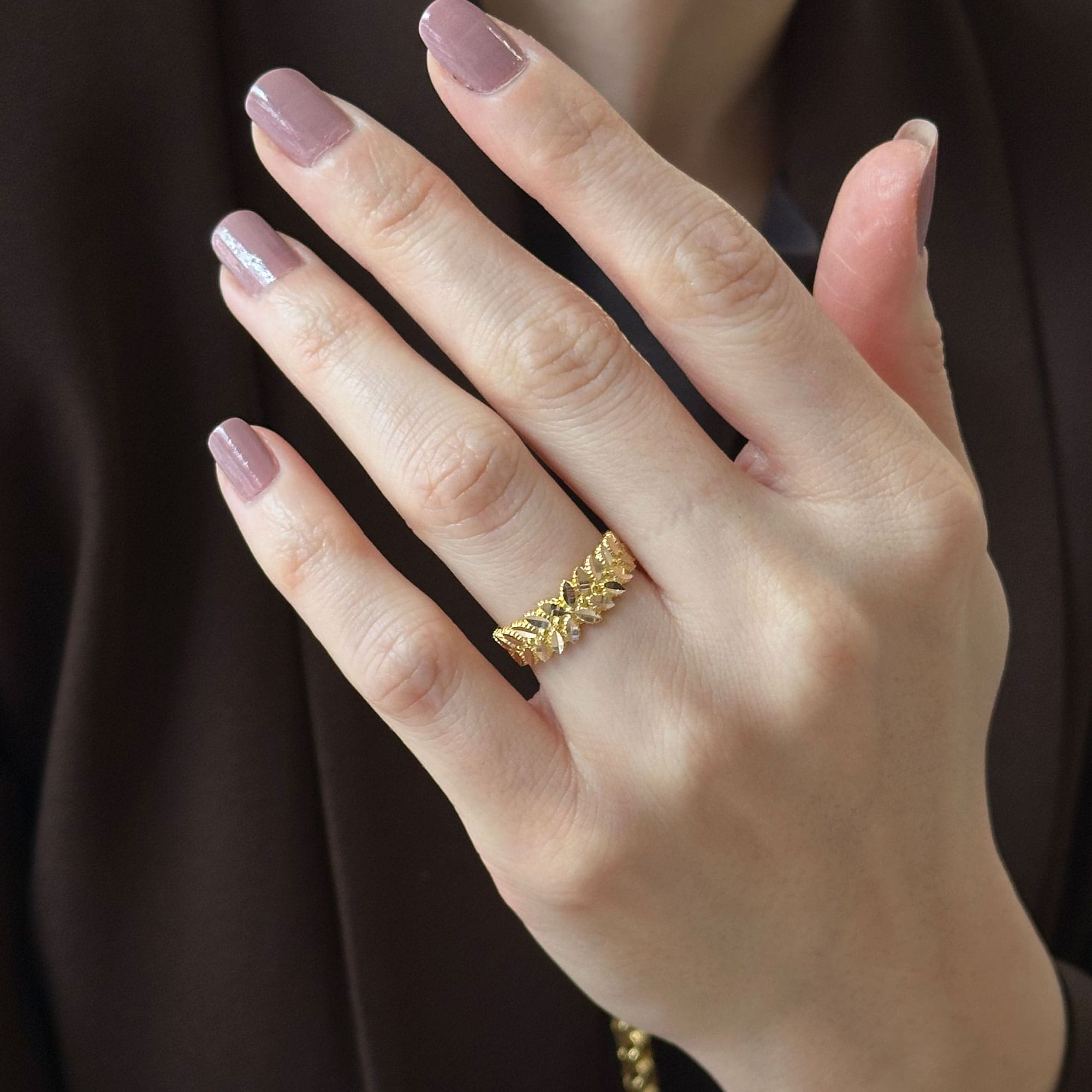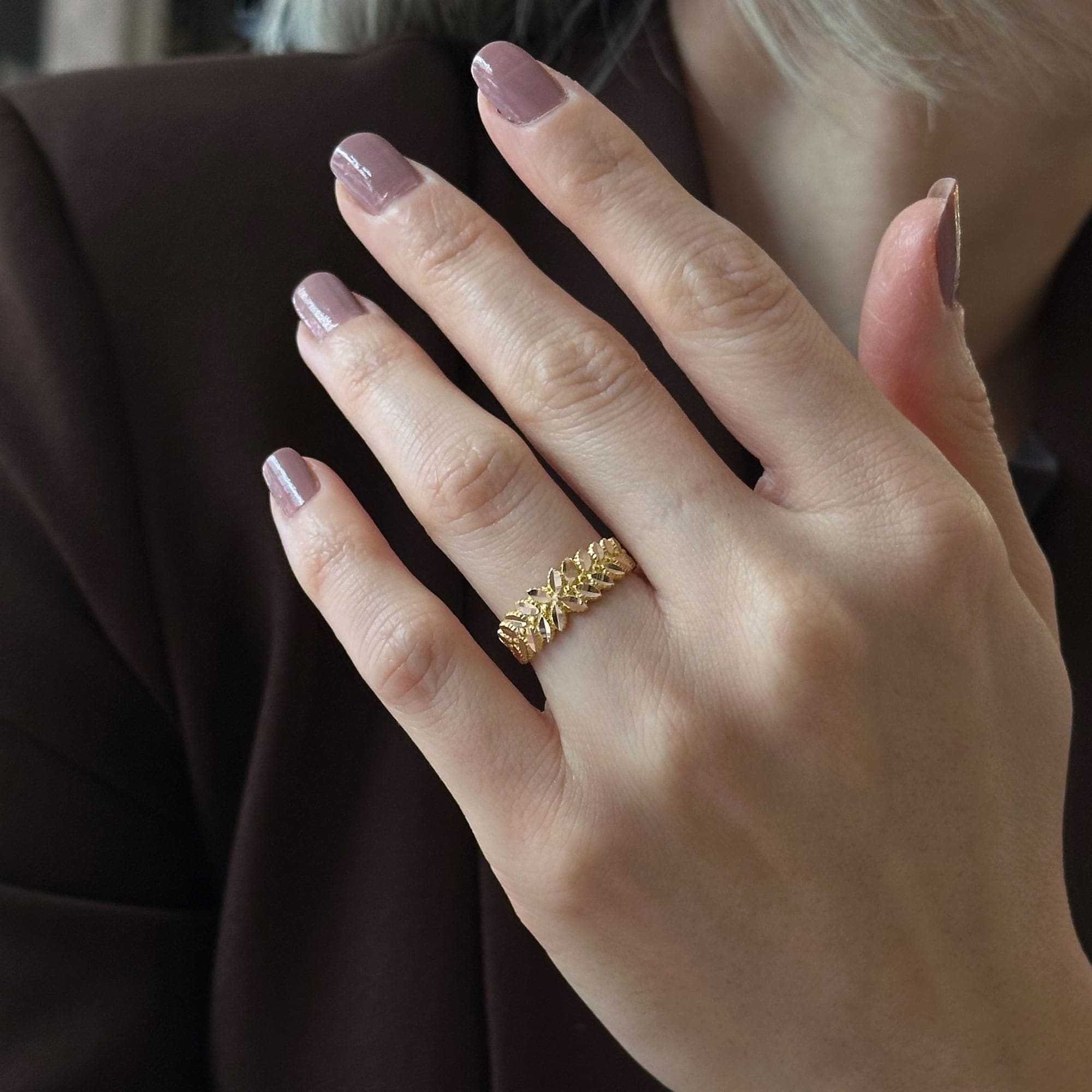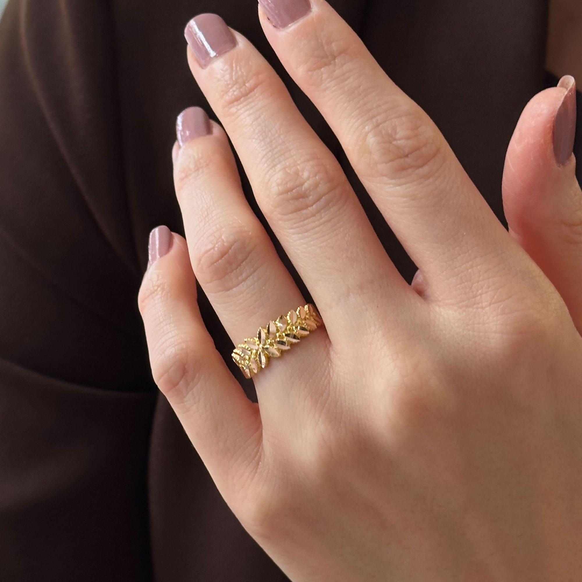 Günlük kombinlerde zarif bir dokunuş, özel davetlerde ise sofistike bir şıklık sunan yüzük; hafif yapısı ve kusursuz işçiliği sayesinde uzun yıllar severek kullanılabilir. Doğal sarmaşık formu, yüzüğe hem romantik hem de asil bir hava katarken, yaprak detayları tasarımı tamamlayarak göz alıcı bir bütün oluşturur.