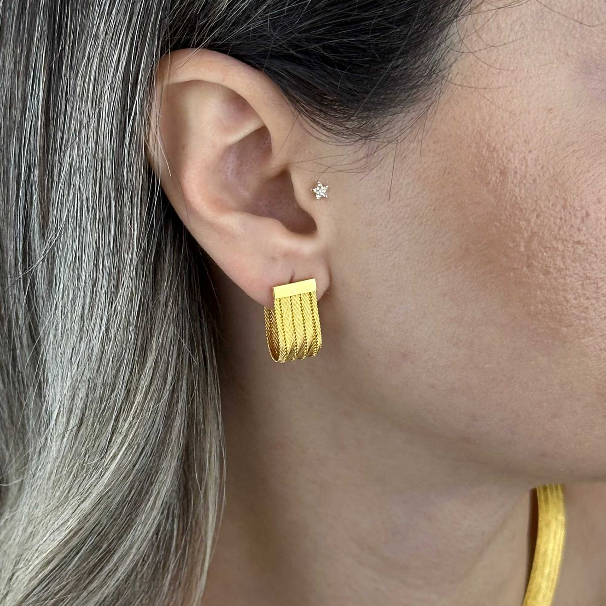 Trabzon hasır küpe, 14 ayar altından üretilmiş zamansız bir tasarımdır. Yaklaşık 6,33 gram ağırlığı ile dolgun ve dengeli bir duruş sunarken, kulakta konforlu bir kullanım sağlar. Sarı altının sıcak tonu, Trabzon hasır işçiliğinin karakteristik dokusunu ön plana çıkarır.