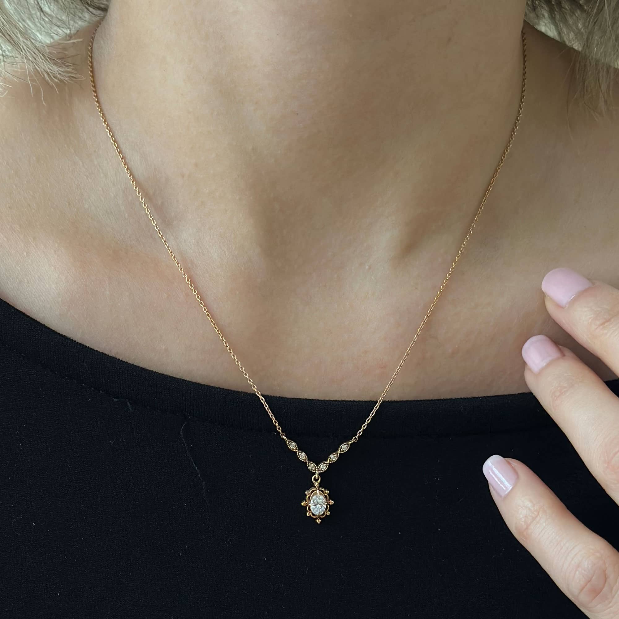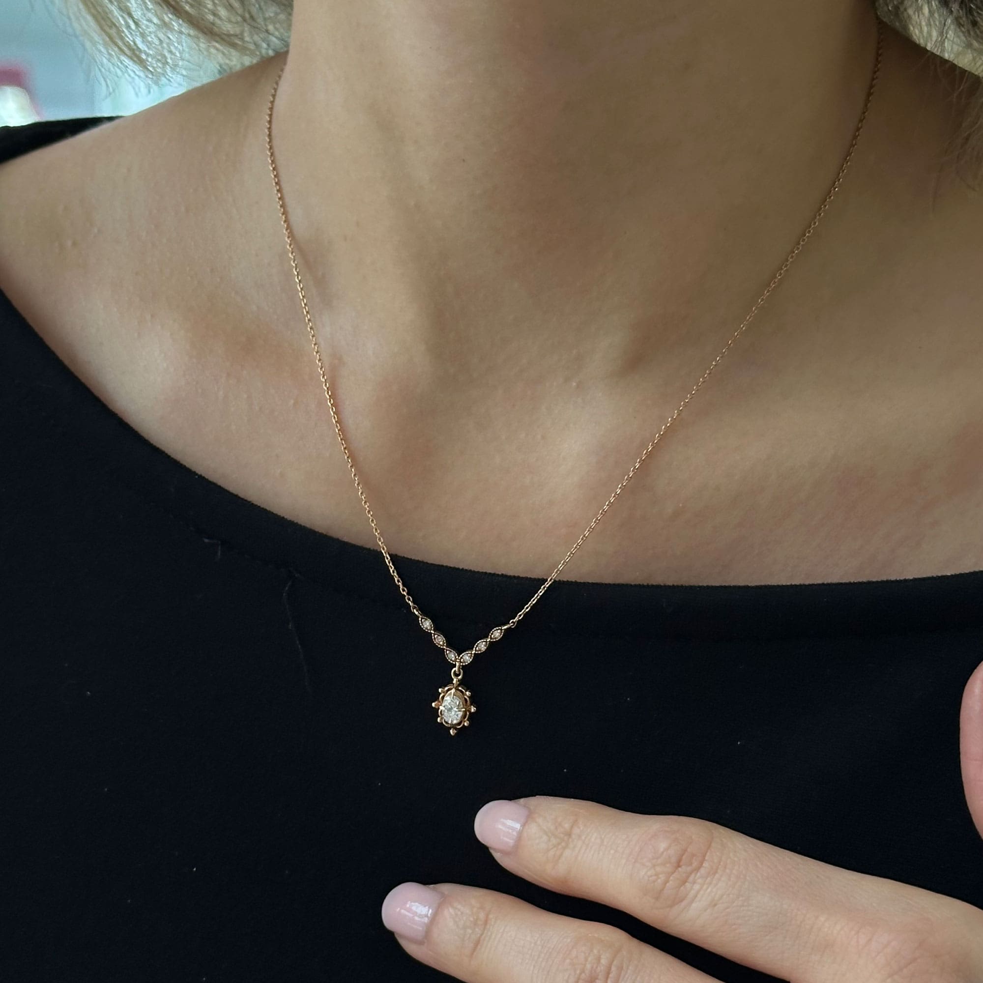 Altın takı tutkunları için ince ve anlamlı bir dokunuş arayanların favorisi olacak bu vintage pırlanta kolye, stilinizi kusursuz bir zarafetle tamamlamanızı sağlar.