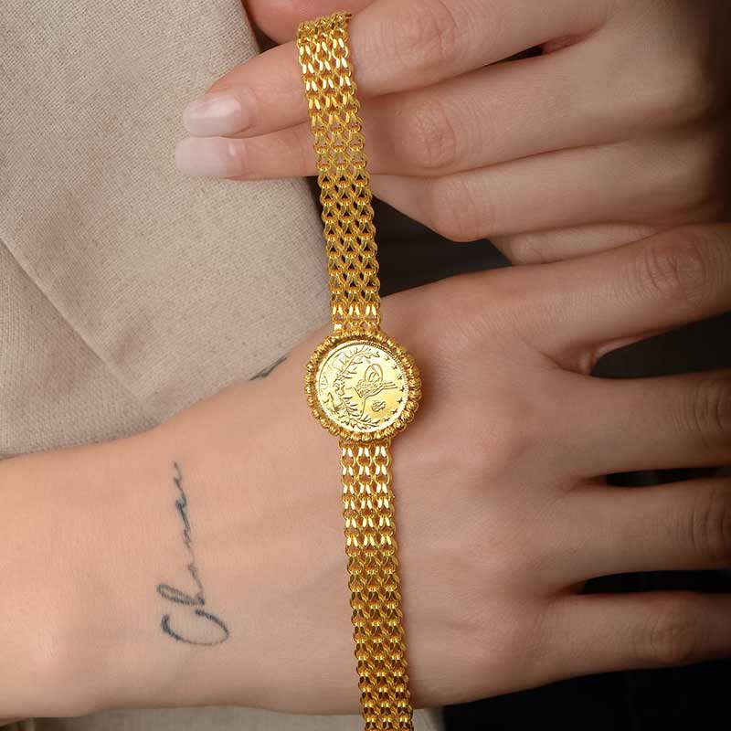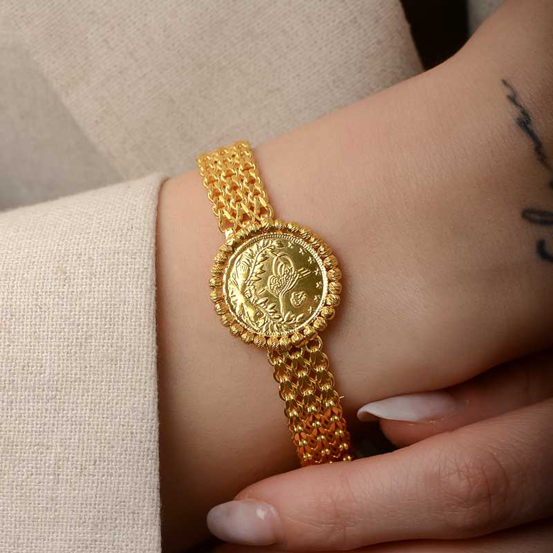 Üründe reşat yarım 3 gr 22 ayar altındır. Geri kalan kısımlar ise 14 ayar altındır .